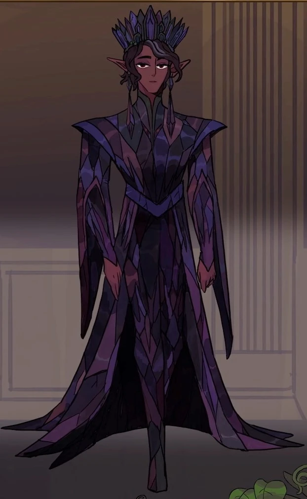 Andhera's Masquerade outfit was made by BINX Choppley. The vibes he gave them to work off of were "prince of darkness", "obsidian stalagmites collected together", "you don't wanna look for too long" (which BINX took to mean "hypnotizing"), "form-fitting", and "gemstone cave crown/tiara/headpiece". BINX assured him he could have a full crown.