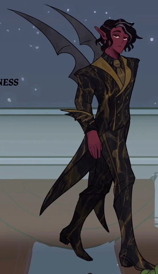 Since childhood, Andhera has grown up significantly, both physically and socially. They are still very awkward, but no longer hide in social settings. They also put on a fake, more fancy sounding accent. Due to Andhera's social standing as the son of the Queen of Air and Darkness as well as his physical attractiveness, he is now the most eligible Bachelor at the Bloom.
