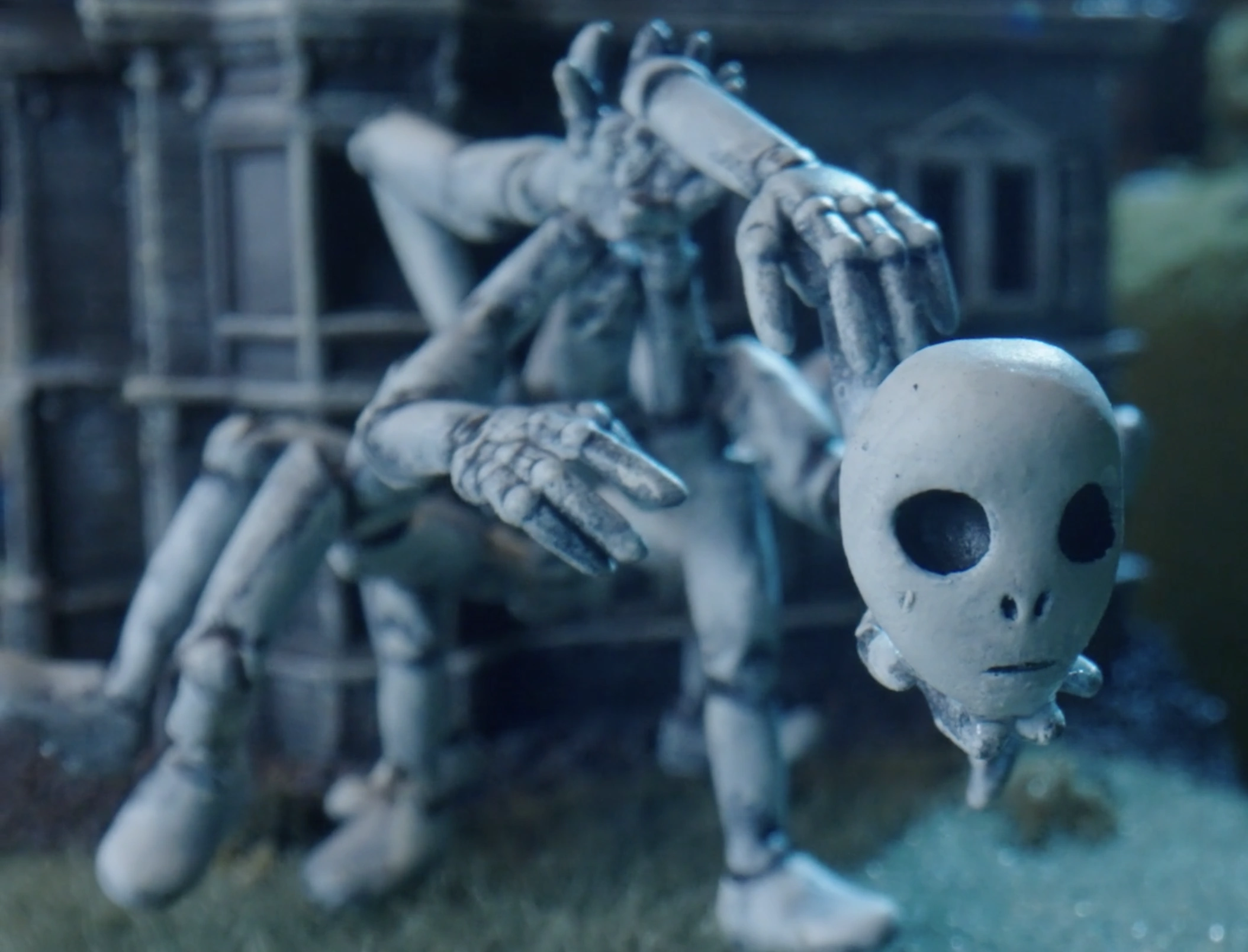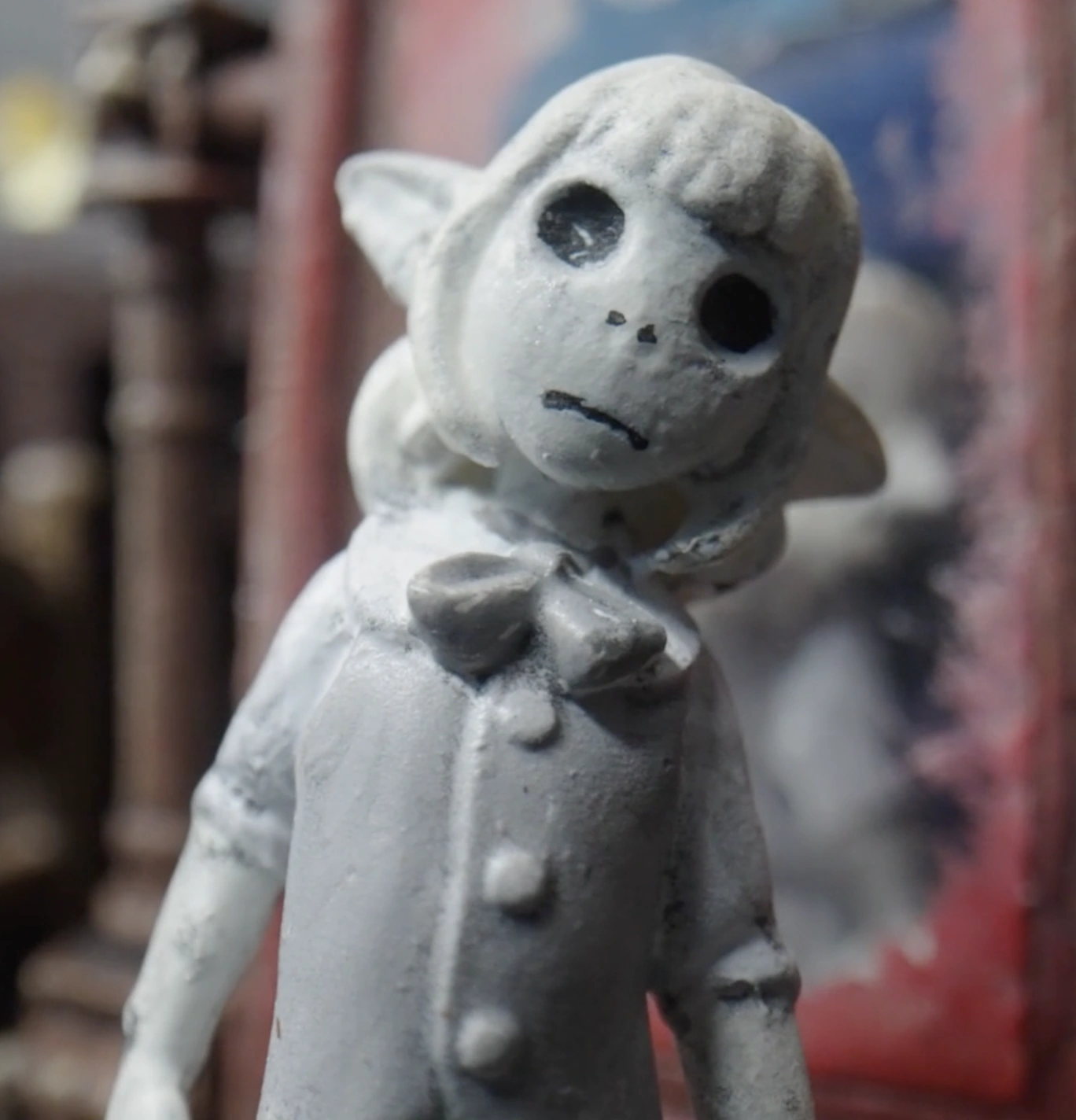 Baron is a 3-foot tall bone-white goblin mannequin made of either bone or ivory. Its joints are articulated into blackness. It wears a white shirt, a vest, and grey pantaloons. As hair, it wears a pure white wig in a Lord Fauntleroy/princeling style. Its face has two nostril holes, two matte black spots for eyes, and a dark, carved line for a mouth.