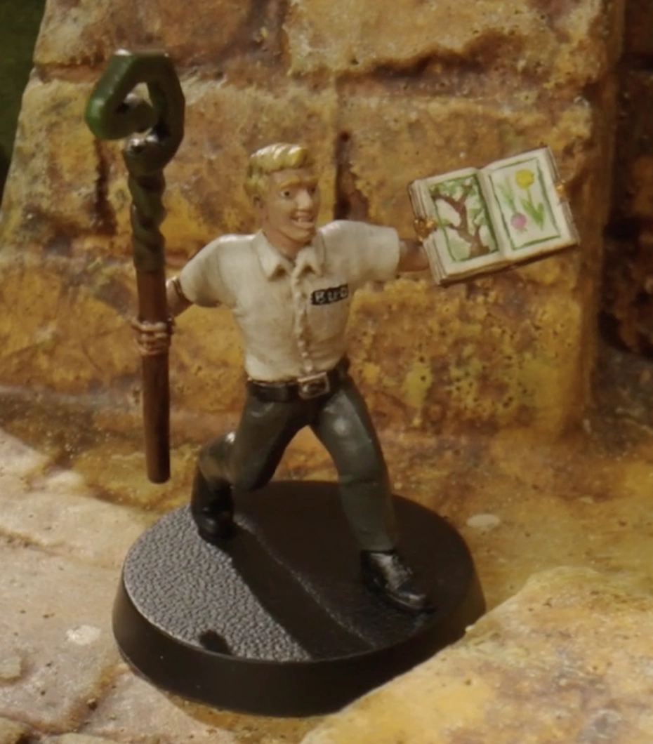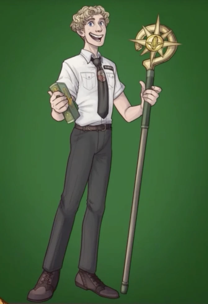 Buddy had blonde, curly hair and wore a white button-up shirt with a black rat-grinders tie, black pants, and carried a staff with Helio's corncob emblem.