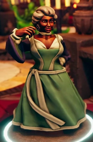 Coeliabranca is a beautiful human woman with an immaculately sculpted "Marie Antoinette" style updo. She wears a huge hoop skirt and long white gloves along with a white rabbit mask that is just from the nose up and ears of a white rabbit on a long silver wand that she holds in front of her face. She is incredibly socially savvy and works for Talcidimir Tallbreeze on The Rombosa as the majordomo.