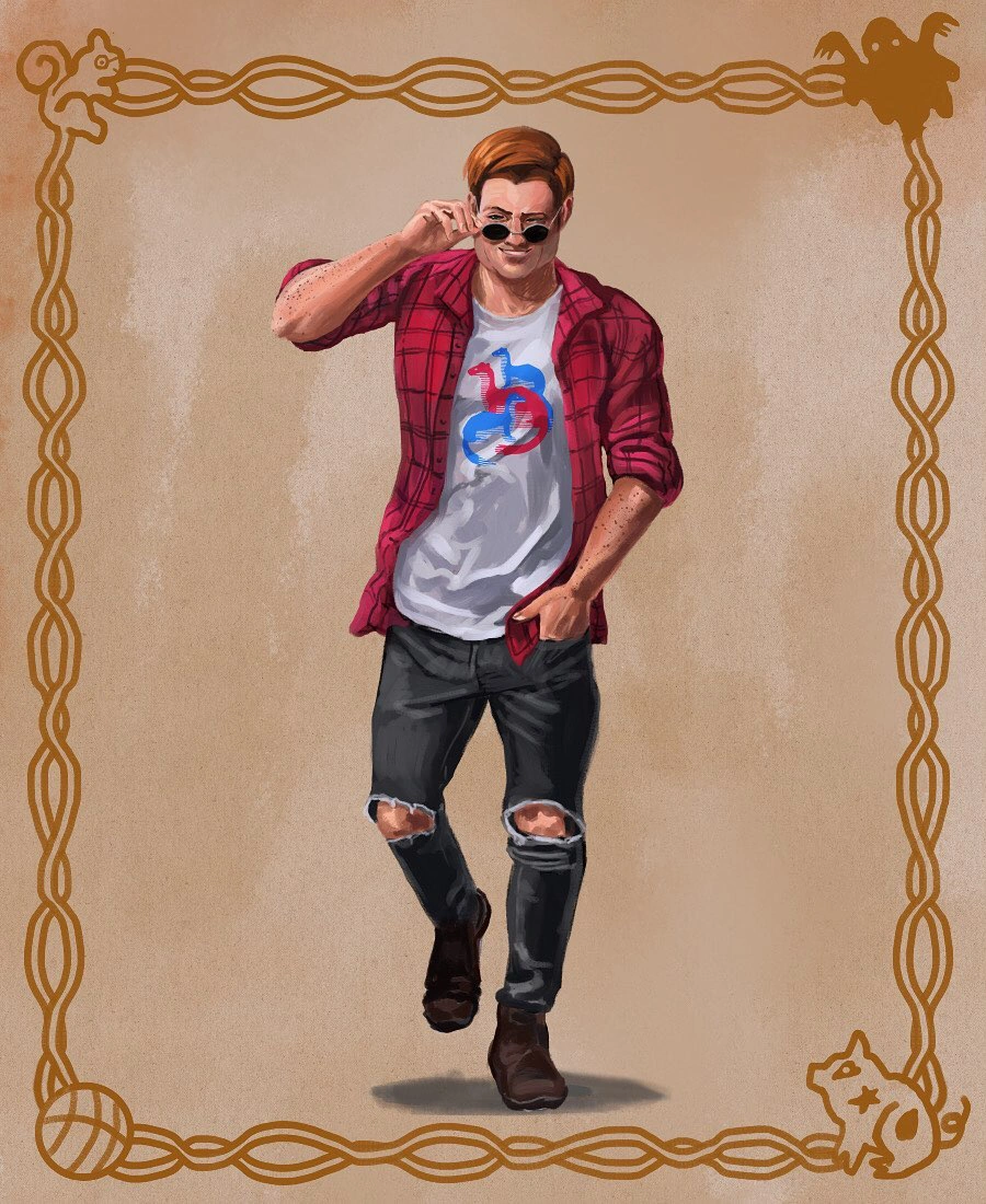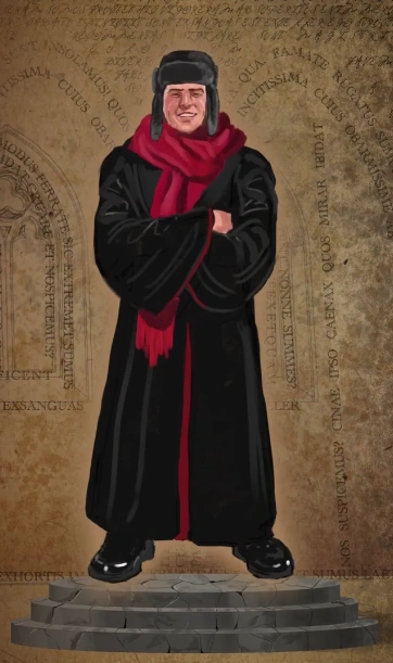 Fergus is a tan, freckly, yoked-up ginger dude about the same height as Whitney Jammer. Also like Jammer, he is an athlete. He wears the red robes of Hercinil.
