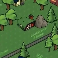 The Luckstone Home is a giant stone that some sort of thatch lean-to has been built up against and curving into. It's a very simple, modest home that obviously bits and pieces have had to be added onto over the years to allow for all the Luckstone children.[1]