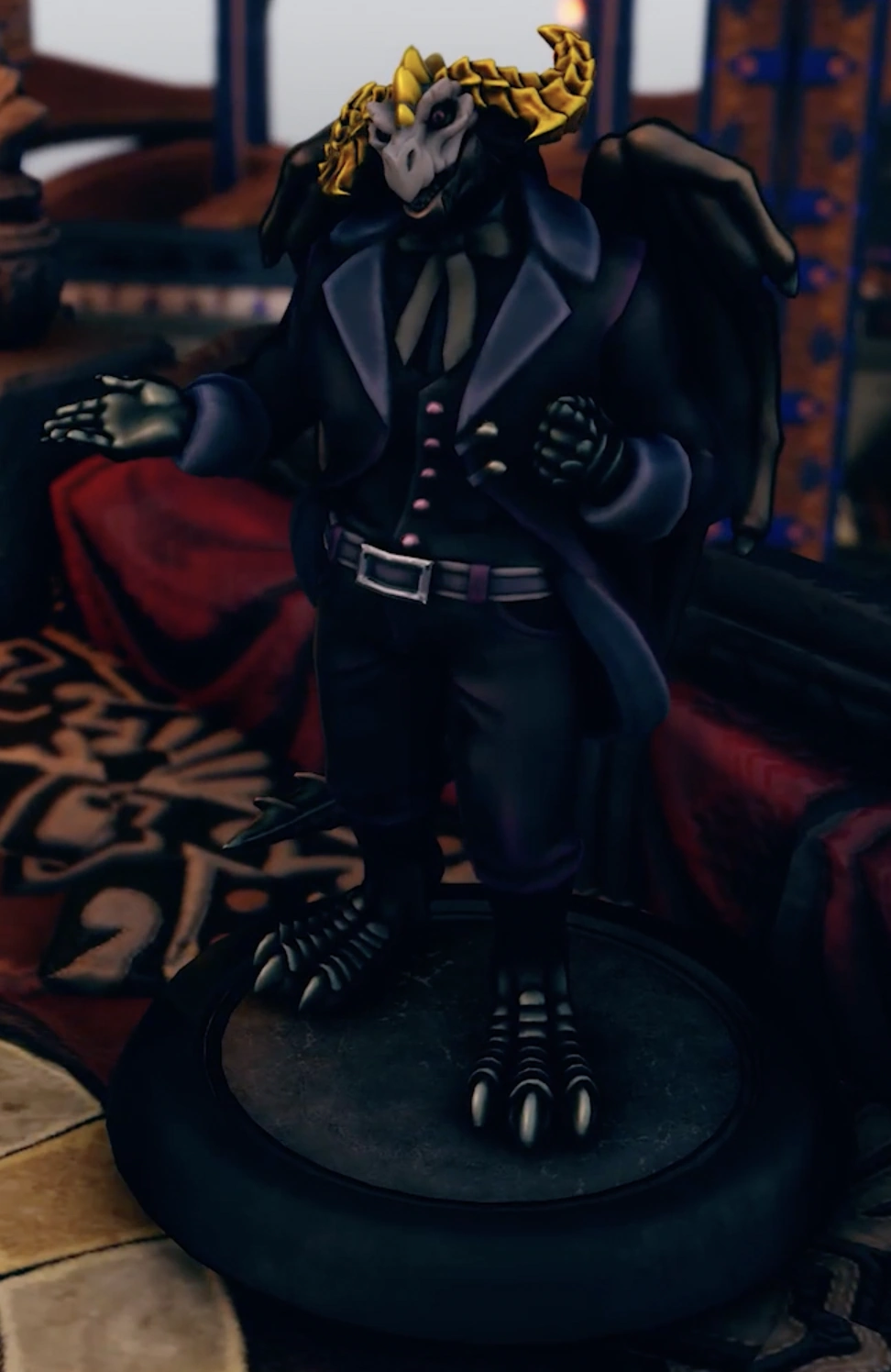 "You approach the dais and see this large dragonborn, black-scaled, bone-white horns. He's got a sort of white skull mask on, purple, beautiful, velvet coat." ― Brennan Lee Mulligan