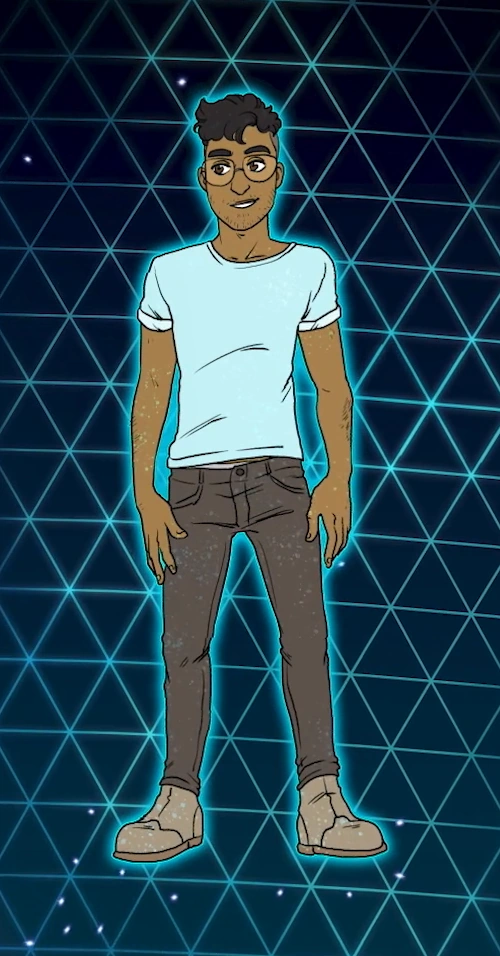 Nasir is a young, Arab-American. He's relatively skinny and has a little poof of hair. He wears glasses and a pastel blue t-shirt.