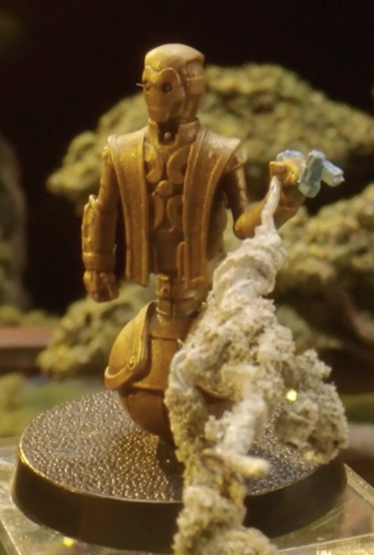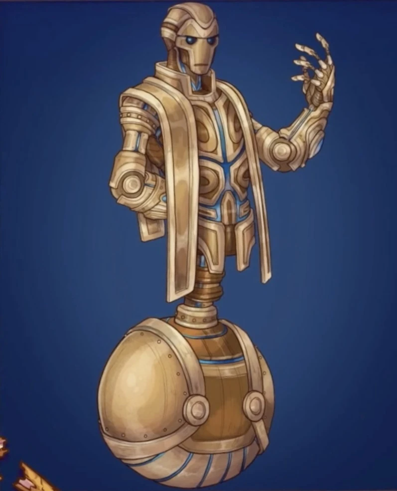 Grix is a golden Warforged spellcaster. Instead of feet he has an enormous wheeled stand.