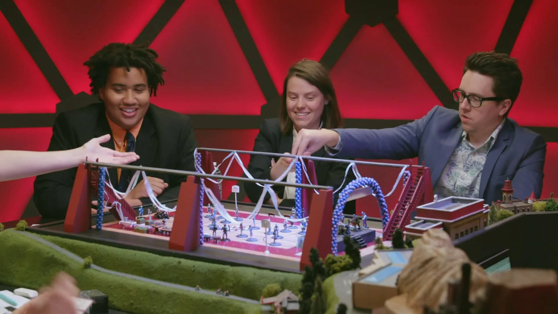 Fabian, using his sneakers of dunking and jumping off the drum set, reaches up to the balloon arch where Penelope is and pulls the balloons to the ground. Penelope is able to flip off the balloons and land on the staircase. Fabian shoots a crossbow at Penelope and sends the Hangman to Fig and Adaine at the other end of the gym. Kalvaxus hits Gorgug with his tail.
