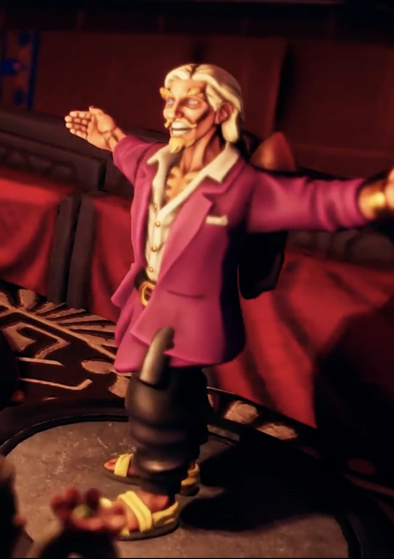 Talcidimir Tallbreeze is incredibly sun-tanned, and has surfer blonde hair and a moustache.