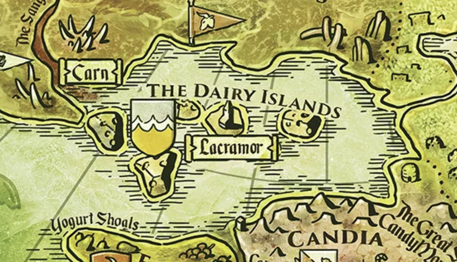 The Dairy Islands are a smaller nation made up of a collection of islands and are very naval-focused. Many of its citizens are sailors, and it's not uncommon for pirates to enter into Candia along the Great Stone Candy Mountains.