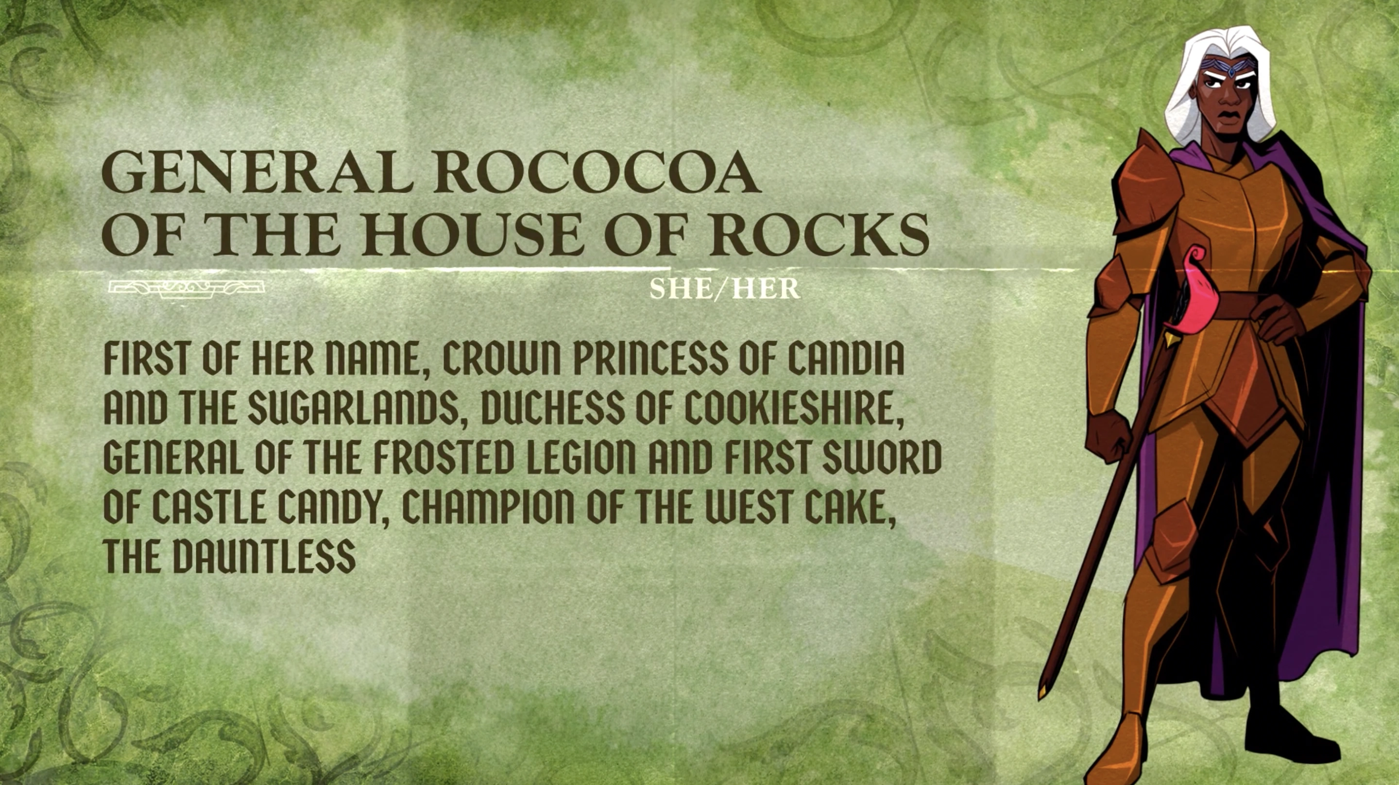 General Rococoa Rocks Candy (Chocolate) - Deceased Crown Princess of Candia. One of Amethar's older sisters and oldest of House Rocks. |