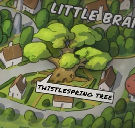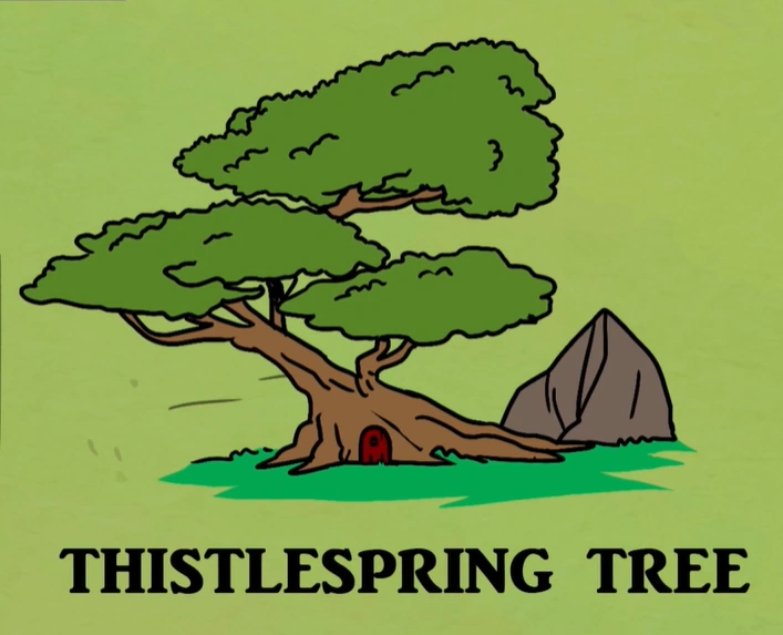 The Thistlespring Tree is the home of Wilma and Digby Thistlespring and their adopted son, Gorgug. It is located in Little Branch, which is the area of Elmville where the small folk live.