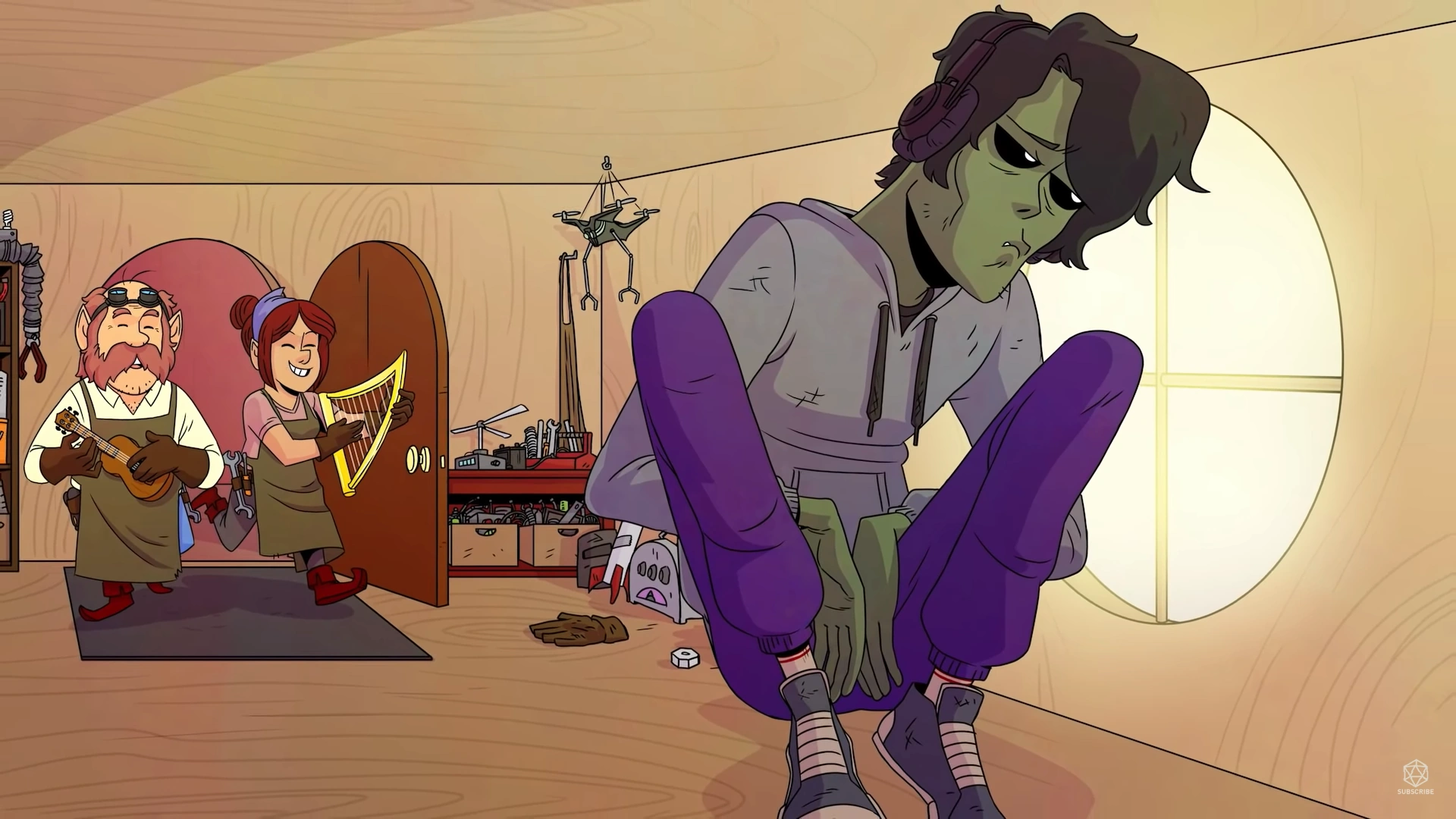 It has a little door and windows, and pulleys and kites and all sorts of things that gnomes make. As Gorgug is an orc and not a gnome, his bed fills most of the house. Inside is a workshop where Wilma and Digby do most of their work.