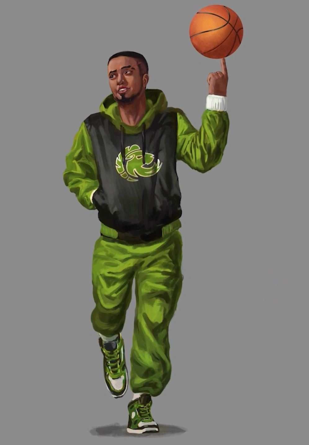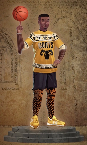 Jammer wears a #25 Chicago Bulls jersey and extremely bright and colorful Kyrie Irving Electro-Lights sneakers. He carries his basketball, Spalding, around with him, as it is now his magical familiar.