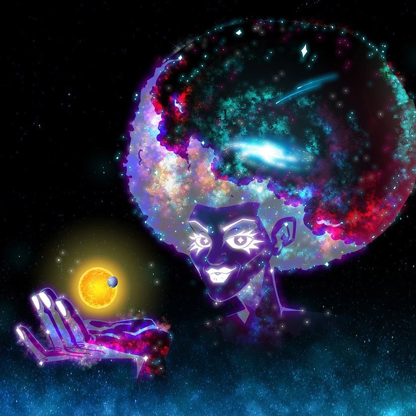 Zarael is expansive across the sky, her hair radiates out from her head and planets orbit it. Her fingertips and jewels become the stars in the sky, her translucent skin is filled with the cosmos, comets, and all of the vast galaxies.